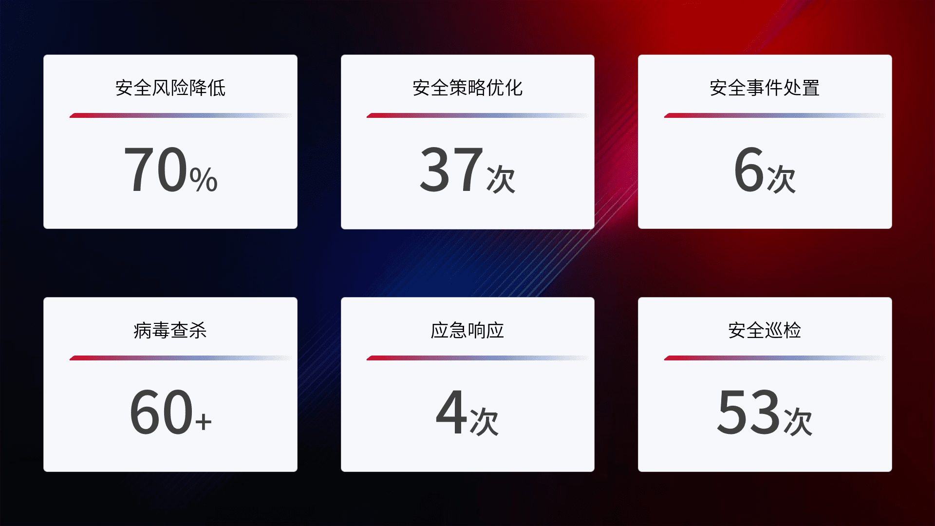 提供全面的安全事件报告体系,,,包括处置报告、、、、周报、、、季度和年度总结,,,,结合持续监控,,,,帮助客户深入了解网络安全状况。。